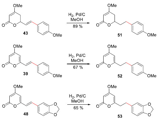 As demais kavalactonas foram preparadas a partir de reaçoes de hidrogenaçao de adutos Heck previamente preparados (Esquema 12). Assim, o aduto Heck 43E teve sua olefina exocíclica hidrogenada e gerou a Kavalactona natural (51) em 89% de rendimento. Outras kavalactonas com cadeias laterais saturadas foram preparadas a partir da hidrogenaçao catalítica das duplas exocíclicas dos adutos Heck Iangonina (39) e da Kavalactona (48), gerando as novas Kavalactonas (52) e (53) em 67% e 65%, respectivamente.