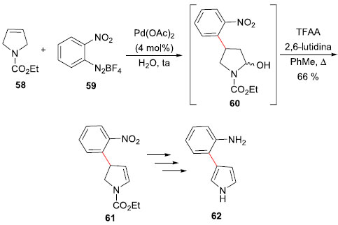 Marinoquinolinas sao compostos naturais de origem marinha que apresentam como característica estrutural uma unidade 3H-pirrolo[2,3-c]quinolina. Dentre estes compostos, podemos citar a Marinoquinolina A (54), um forte inibidor da acetil-colinesterase, isolada a partir da bactéria marinha Rapidithrix thailandica em 2006.45 Outras Marinoquinolinas, designadas como B (55), C (56) e E (57), foram isoladas de Ohtaekwangia kribbenses,46 e todas exibiram moderadas citotoxicidades contra linhagens de células cancerosas. Estes interessantes compostos naturais também foram alvo de investigaçao sintética pelo grupo de pesquisa do professor Correia, que desenvolveu uma síntese total concisa e divergente, apresentando a reaçao de Heck-Matsuda em água e a reaçao Pictet-Spengler como etapas-chave.47 A síntese teve início através da reaçao de arilaçao Heck-Matsuda em água pura entre o 3-pirrolina 58 e o sal orto-nitro-benzenodiazônio (59) como passo fundamental. A presença de acetonitrila como solvente levou à decomposiçao do material. O produto de acoplamento lactamol 60 precisou ser imediatamente desidratado em condiçoes ácidas, para entao fornecer o aril-enecarbamato 61 em 66% para as duas etapas (Esquema 13). Uma sequência de oxidaçao, hidrólise e reduçao permitiu a síntese do intermediário-chave pirrolil-anilina 62 em 55% de rendimento.