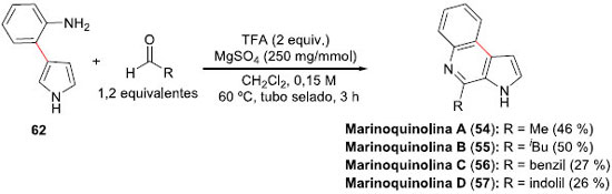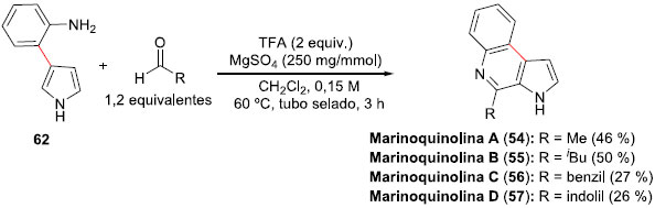 A partir da obtençao da pirrolil-anilina 62, a síntese das Marinoquinolinas pode ser obtida através da reaçao de Pictet-Spengler com os aldeídos apropriados, seguida por aromatizaçao, sendo realizadas em um único passo reacional, seguido pela aromatizaçao in situ do aduto de Pictet-Spengler (Esquema 14). Após alguma experimentaçao, o uso de TFA/CH2Cl2 em tubo selado à 60 ºC foi a melhor condiçao alcançada, ainda que os rendimentos obtidos para a síntese das Marinoquinolinas A (54), B (55), C (56) e E (57) a partir de 62 tenham sido apenas modestos.