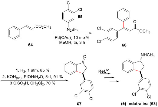 Sínteses totais de fármacos empregando a reaçao de Heck A (±)-Indatralina (Lu 19-005) (63) é um potente psicoativo terapêutico com atividade inibitória para reabsorçao de monoaminas, incluindo transportadores de dopamina e serotonina,48 e que possui efeito inibitório em consumo de cocaína por macacos.49 Para sua síntese formal, Correia e colaboradores desenvolveram um método eficaz e estereosseletivo para a preparaçao de β,β-di-aril-acrilatos em rendimentos elevados, empregando para tal uma reaçao de Heck-Matsuda entre cinamato de metila (65) com sais tetra-flúor-boratos de arenodiazônio.50 Após uma extensa investigaçao, as melhores condiçoes reacionais foram aquelas obtidas através do uso de metanol como solvente e acetato de Pd(II) como catalisador (10 mol%), sem a adiçao de base. Notou-se que as melhores diastereoseletividades foram alcançadas através da reaçao com sais de arenodiazônio contendo grupos retiradores de elétrons, demonstrando uma acentuada dependência da diastereosseletividade da reaçao de Heck-Matsuda com a natureza eletrônica do eletrófilo empregado. Desenvolvida a metodologia, a síntese formal da (±)-Indatralina (63) iniciou pela arilaçao de Heck-Matsuda entre 64 e o tetra-flúor-borato de 3,4-dicloro-benzenodiazônio (65), levando ao β,β-di-aril-acrilato 66 (Esquema 15). Uma sequência de transformaçoes (hidrogenaçao, hidrólise básica e posterior ciclizaçao em meio ácido) forneceu o conhecido precursor 67,51 já empregado para a síntese da (±)-Indatralina (63) e, portanto, representando sua síntese formal.