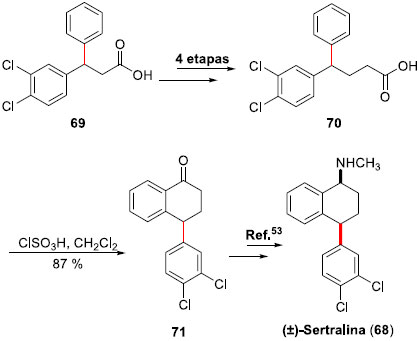 Empregando a mesma metodologia, Correia e colaboradores puderam obter a síntese da (±)-Sertralina (Zoloft ®) (68). O interesse da preparaçao desta substância advém do uso comercial do fármaco, empregado para tratamentos de depressao e dependência.52 O intermediário ácido di-arilado 69 foi submetido a uma homologaçao empregando o protocolo de Arndt-Eistert, fornecendo o ácido homologado 70 em 73% de rendimento para as 4 etapas. Ciclizaçao com ácido clorossulfônico permitiu a preparaçao da tetralona 71, a qual pode ser convertida à (±)-Sertralina (68) através de condiçoes descritas na literatura53 (Esquema 16).