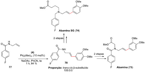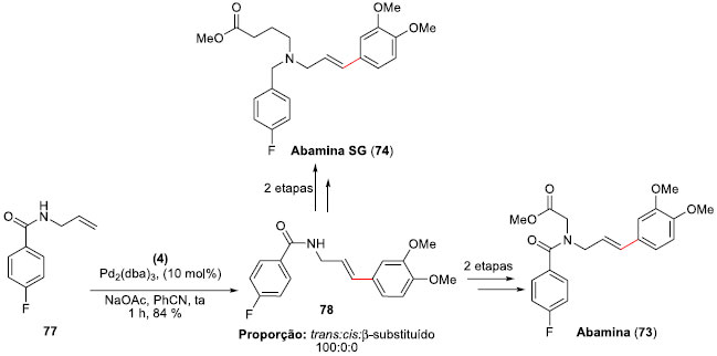 Para a síntese das Abaminas (73) e (74), foi preparada a alil-benzamida 77, a qual foi submetida às condiçoes de arilaçao de Heck-Matsuda anteriormente otimizadas com o tetra-flúor-borato de 3,4-dimetóxi-benzenodiazônio (4). O produto desejado 78 foi obtido em um rendimento de 84%, com total controle régio e estereoquímico do isômero E (Esquema 18). A partir deste aduto de Heck, as sínteses da Abamina (73) e da Abamina SG (74) foram finalizadas em duas etapas, permitindo suas sínteses totais em cinco etapas e em 53% e 55% de rendimento global, respectivamente.