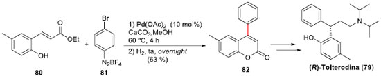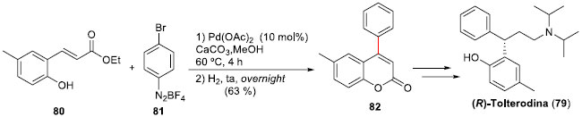 Tendo já sido desenvolvida a arilaçao de Heck-Matsuda com derivados do tipo cinamatos, Correia e colaboradores expandiram esta metodologia para orto-hidróxi-derivados. Esta modificaçao permitiu uma eficiente estratégia de acesso a 4-aril-cumarinas,57 realizando uma concisa síntese total da (R)-Tolterodina (79), uma droga anti-muscarínica empregada em tratamento de incontinência urinária,58 em quatro etapas e em elevado rendimento global (30%) (Esquema 19). A síntese iniciou-se pela reaçao Heck-Matsuda entre o éster orto-hidróxi-cinamato (80) e o sal de arenodiazônio 81, sob condiçoes otimizadas, para fornecer a 6-metil-4-fenil-cumarina (82), em 63% de rendimento isolado após duas etapas. Instalaçao do centro estereogênico através de reduçao assimétrica, e posterior reaçao de aminaçao redutiva encerraram a preparaçao da (R)-Tolterodina (79).