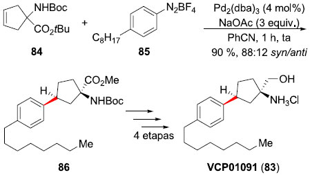 VPC01091 (83) é um agonista seletivo para o receptor da esfingosina-1-fosfato do subtipo 1 (S1P1),59 e pertence a uma classe de drogas importantes no tratamento de esclerose múltipla, por possuir poucos efeitos colaterais. Devido a sua complexidade, sua síntese se tornou um grande desafio, sendo necessário o desenvolvimento de uma versao diastereosseletiva da reaçao de Heck-Matsuda, o que foi alcançado pelo grupo do professor Correia em 2012.60 Carbamatos ciclopentenoicos foram arilados, fornecendo uma série de ciclopentenos em excelentes syn-diastereosseletividades (>85:15). Os autores postulam que a coordenaçao do metal na mesma face do grupo carbamato seria a origem da seletividade observada. Deste modo, a reaçao de arilaçao de Heck-Matsuda entre o carbamato cíclico 84 (obtido a partir do malonato de dimetila em 4 etapas e 61% de rendimento) e o tetra-flúor-borato de 4-octil-benzenodiazônio (85), realizada na presença de Pd2(dba)3 (4 mol%) e AcONa (3 eq.) em benzonitrila, forneceu o aduto Heck 86 em 90% de rendimento e boa seletividade syn:anti (88:12) (Esquema 20). Uma série de manipulaçoes sintéticas permitiu a transformaçao deste aduto ao VPC01091 (83) em um total de 5 etapas e 40% de rendimento total.61