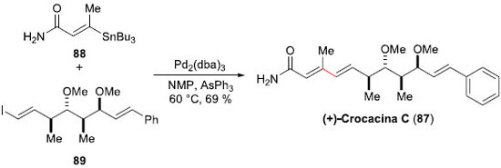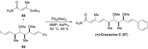 A Crocacina C (87) é um, dentre quatro produtos naturais, que sao normalmente encontrados nos extratos das Chondromyces crocatus e Chondromyces pediulatus, que inibem moderadamente o crescimento de algumas bactérias Gram-positivas, bem como fungos e leveduras.65,66 Para realizar sua síntese total, no início dos anos 2000, Dias e colaboladores,67 da UNICAMP/SP, projetaram empregar o acoplamento de Stille como etapa-chave. Para a síntese dos fragmentos envolvidos na reaçao de acoplamento cruzado, a E-vinil-estanana 88 foi preparada em 3 etapas e 50% de rendimento, a partir do 2-butinoato de etila (Esquema 22). O fragmento mais complexo, o iodeto E-vinilico 89, necessitou de 14 etapas para ser sintetizado, e foi obtido em excelentes 23% de rendimento global. A reaçao de acoplamento de Stille entre a E-vinil-estanana 88 com o iodeto E-vinílico 89 foi realizada em NMP a 60 ºC, com uma quantidade catalítica de Pd2(dba)3 e na presença de AsPh3, proporcionando a (+)-Crocacina C (87) em 69% de rendimento, após purificaçao por cromatografia em coluna de sílica gel. Deste modo, a síntese do composto 88 foi alcançada em 15 etapas, em um rendimento global de 16%.