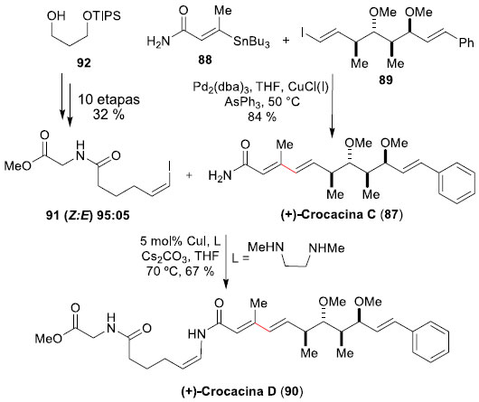Para a síntese da (+)-Crocacina D (90), um membro mais complexo da família das crocacinas, Dias e colaboradores68 aproveitaram sua síntese anterior da (+)-Crocacina C (87). Como a (+)-Crocacina D (90) possui um grupo substituinte na amida presente na estrutura de 87, a síntese total se deu pela uniao entre o produto natural anteriormente preparado, através de acoplamento de Stille, agora em condiçoes otimizadas, e o fragmento iodeto Z-vinílico 91 (preparado em 10 etapas e 32% de rendimento global a partir do diol 92). A síntese assimétrica convergente de 90 se deu pelo eficiente acoplamento entre a (+)-Crocacina C (87) e o (Z)-vinil iodeto 91, mediado por cobre,69 levando à obtençao da (+)-Crocacina D (90) em 67% de rendimento (Esquema 23). A síntese total foi realizada em 16 etapas e 14% de rendimento global.