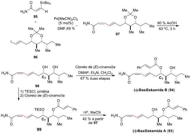 As (-)-Basiliskamida A (93) e (-)-Basiliskamida B (94) sao policetídeos isolados da bactéria marinha PNG-276, encontrada na costa da Papua Nova Guiné.70 Estes policetídos apresentam potente atividade antifúngica in vitro contra Cândida albicans e Aspergillus fumigatus, similar à Amfotericina B. Dias e colaboradores realizaram a síntese total dessas moléculas, empregando a reaçao de Stille como etapa-chave. A primeira destas sínteses reportada foi a da (-)-Basiliskamida B (94), em 2008, que envolveu 12 etapas produzindo o produto desejado em rendimento global de 6%.71 A etapa de acoplamento cruzado Stille deu-se entre a E-vinil-estanana 95, preparada em 2 etapas e 20% de rendimento, a partir do propiolato de etila, e o iodeto E-vinílico 96, que requereu um total de 12 etapas e foi construído em 9% de rendimento global. O acoplamento foi realizado em DMF e com uma quantidade catalítica (5 mol%) de Pd(MeCN)2Cl2, à 25 ºC, e proporcionou o aduto de Stille 97 em 69% de rendimento após purificaçao por cromatografia em coluna de sílica (Esquema 24). A conclusao da síntese foi efetuada com a remoçao do isopropilideno-cetal com AcOH 80%, fornecendo o diol 98, seguido da acilaçao seletiva do oxigênio menos impedido com cloreto de E-cinamoíla, levando à (-)-Basiliskamida B (94). Para a síntese da (-)-Basiliskamida A (93), que difere de 94 apenas pela posiçao do grupo cinamoíla, Dias e colaboradores utilizaram da maior reatividade da hidroxila em C7 para protegê-la antes da reaçao de esterificaçao.72 Assim, reaçao do diol 98 com TES-Cl permitiu a proteçao da hidroxila mais desimpedida, deixando a hidroxila em C9 livre para a posterior reaçao de esterificaçao, fornecendo o intermediário 99. Posterior remoçao do protetor de silício com HF, forneceu a (-)-Basiliskamida A (93) em 42% de rendimento e 4 etapas a partir do aduto de Stille 97.