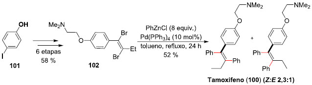 Um exemplo de versatilidade da reaçao de Negishi na síntese total de um produto de interesse foi descrita pelo professor Pilli e colaboradores,75 em trabalho desenvolvido na UNICAMP/SP, em seus estudos visando a síntese do (Z)-Tamoxifeno (100), um agente anti-estrogênico de uso clínico na terapia do câncer de mama.76 A síntese teve início a partir do 4-iodo-fenol (101), sendo necessárias 6 etapas (58% de rendimento global) para a síntese do intermediário dibromado 102 que seria utilizado no duplo acoplamento Negishi. A reaçao levou à síntese do desejado (Z)-Tamoxifeno (100), junto com o seu isômero (E), este último através de uma reaçao competitiva de syn-carbopaladaçao. A síntese completa envolveu 7 etapas e foi alcançada em 30% de rendimento total, com seletividade 2,3:1 dos isômeros geométricos (Z:E), respectivamente (Esquema 26).