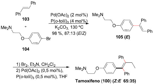 A síntese do (Z)-Tamoxifeno (100) também foi realizada pelo grupo do prof. Monteiro e colaboradores, em estudos realizados na UFRGS/RS. Em sua estratégia sintética,77 a preparaçao do composto alvo teve início pelo trans-estilbeno (103). A olefina foi submetida a condiçoes de acoplamento de Heck, empregando um sistema catalítico composto de Pd(OAc)2 e P(o-tolil)3, com o bromobenzeno 104, fornecendo o tri-aril-alceno 105, em altos rendimento e seletividade (Esquema 27). Bromaçao de 105 levou ao bromo-tri-arilalceno, o qual foi submetido ao protocolo de acoplamento cruzado de Negishi com EtZnCl, empregando tol-BINAP como ligante do catalisador Pd(OAc)2. Este último acoplamento permitiu a síntese do (Z)-Tamoxifeno (100), junto com seu isômero (E), em 74% de rendimento e seletividade final de 65:35 (Z:E). O uso de dois acoplamentos mediados por paládio permitiu a síntese do alvo em apenas 3 etapas e 57% de rendimento global.78