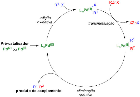 Algumas características gerais da reaçao sao as seguintes: i) tanto fosfinas de paládio como as de níquel funcionam bem como catalisadores. No entanto, os complexos de paládio tendem a fornecer rendimentos e estereosseletividade melhores, e sua tolerância com grupos funcionais é superior; ii) os catalisadores ativos de Ni(0) e Pd(0) sao relativamente instáveis, mas estes podem ser gerados in situ a partir de complexos mais estáveis de Ni(II) e Pd(II) empregando um agente redutor (por exemplo, 2 equivalentes de DIBAL-H ou n-BuLi); iii) os vários reagentes de organo-zinco podem ser preparados por reaçao direta do halogeneto orgânico com metal de zinco ou zinco metálico ativado ou por transmetalaçao do correspondente organolítio ou reagente de Grignard com um halogeneto de zinco (ZnX2); iv) outras vantagens da utilizaçao de organo-zincos incluem: elevada reatividade, elevadas régio e estereosseletividade, ampla aplicabilidade, poucas reaçoes laterais e quase nenhuma toxicidade. Uma das limitaçoes do acoplamento cruzado de Negishi é que alquil-zincos secundários e terciários podem sofrer isomerizaçao, além da reaçao com CO através de reaçoes de inserçao. O mecanismo do acoplamento é análogo aos de outros acoplamentos mediados por paládio (Figura 3), e tem como etapas distintas: i) adiçao oxidativa do haleto orgânico à espécie de Pd(0) para formar Pd(II); ii) transmetalaçao; e iii) eliminaçao redutiva para formar a ligaçao C-C e regeneraçao do catalisador de Pd(0).
