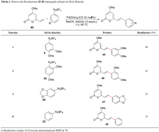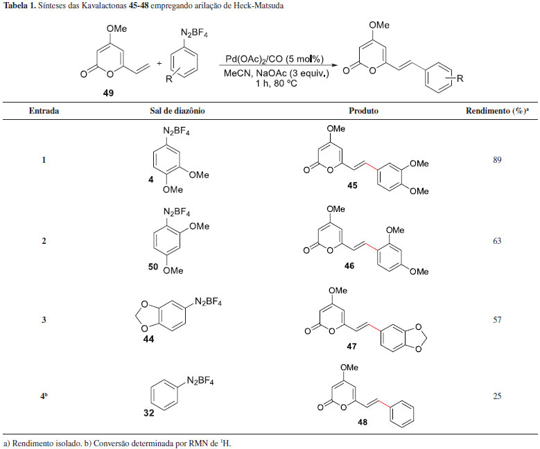 Em 2012, Correia e colaboradores expandiram a metodologia de arilaçao de Heck-Matsuda e propuseram a síntese de outros compostos naturais da família das kavalactonas.42 Como alvos, além de outras lactonas isoladas de P. methysticum, em um total de 4 novos produtos naturais, os autores também prepararam três pironas bioativas isoladas de Polygala sabulosa,43,44 uma erva largamente encontrada no sul do Brasil. As kavalactonas que foram sintetizadas envolvendo uso das reaçoes de Heck-Matsuda foram a Kavalactona (45) e a 11-metóxi-Angonina (46), isoladas de P. sabulosa, além da demetóxi-Angonina (47) e da Kavalactona (48), isoladas de P. methysticum. As sínteses envolveram a reaçao de arilaçao entre a pirona 49 e os sais de arenodiazônio 4, 51, 44 e 32, respectivamente (Tabela 1). As reaçoes foram executadas em atmosfera de CO, MeCN na presença de AcONa e o catalisador empregado foi Pd(OAc)2 (5 mol%). As kavalactonas foram obtidas em rendimentos entre 25-89%. A vinil-pirona 49 foi preparada a partir do ácido desidroacético, em quatro etapas e rendimento global de 23%.