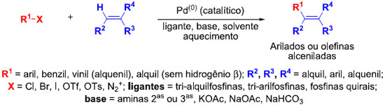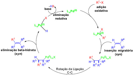O ciclo catalítico para a reaçao de Heck envolve uma série de transformaçoes do catalisador de paládio (Pd0), que geralmente é preparado in situ a partir de um catalisador de paládio(II) precursor.16 O mecanismo mais aceito (Figura 1) descreve uma sequência de eventos que começam com a geraçao de Pd(0) como catalisador ativo e tem como passo determinante da velocidade a adiçao oxidativa de Pd(0) para a ligaçao C-X. Em seguida, é formado um complexo π com o alceno, seguido de uma adiçao syn. Por fim, há a rotaçao da ligaçao C-C e, no passo seguinte, ocorre a etapa de eliminaçao redutiva, regenerando o catalisador pela açao de uma base e recomeçando todo o processo.