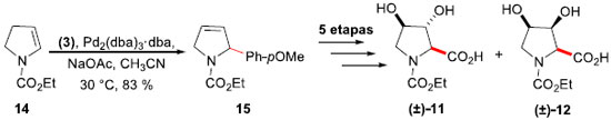 Aprimorando o trabalhado sobre arilaçao de Heck-Matsuda de enecarbamatos endocíclicas e pirrolinas, empregando sais de arenodiazônio como uma forma eficaz de introduçao de anéis aromáticos em uma estrutura heterocíclica, Correia e colaboradores aprofundaram sua investigaçao sobre compostos heterocíclicos bioativos naturais e nao naturais que possuem um anel aromático alfa a um nitrogênio heterocíclico em um anel de pirrolidina poli-hidroxilado.20 Deste modo, a síntese das trans- e cis-3,4-di-hidróxi-prolinas (±)-(11) e (±)-(12), respectivamente, bem como a síntese do (2R,3R,4R,5R)-2,5-di-hidróxi-metil-3,4-di-hidróxi-pirrolidina (DMDP) (+)-(13), tornaram-se um objetivo alcançável. O composto (±)-11 é um constituinte da verotoxina, isolada a partir de um fungo tóxico (Amanita virosa), popularmente conhecido como "anjo-destruidor",21 enquanto (±)-12 é encontrado como um constituinte da proteína Mefp1, produzida pelo molusco marinho Mytilus edulis.22 A síntese dos epímeros foi realizada a partir do enecarbamato de cinco membros 14, tendo como etapa chave a arilaçao de Heck-Matsuda com o sal tetra-flúor-borato de p-metóxi-benzenodiazônio (3) em acetonitrila, promovendo a formaçao da 2-arilpirrolina 15 em 83% de rendimento, sem quaisquer quantidades detectáveis do aduto Heck isomerizado (Esquema 4). A partir deste intermediário em comum, as sínteses de (±)-11 e (±)-12 foram obtidas em um total de 6 e 5 etapas em 17% e 45% de rendimento, respectivamente.