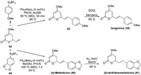 Outro estudo desenvolvido por Correia e colaboradores está relacionado com a expansao da metodologia de acoplamento mediada por paládio, tendo como substratos ésteres alílicos empregando sais de arenodiazônio em reaçoes de arilaçao de Heck-Matsuda.38 A metodologia, publicada em 2009, é atrativa pelas condiçoes suaves empregadas e altas estéreo e regiosseletividades obtidas, e permitiu aos autores propor as sínteses totais das lactonas Iangonina (39), que apresenta atividades ansiolítica, sedativa, anti-inflamatória e analgésica,39 bem como das (±)-Metisticina (40) e (±)-di-Hidrometisticina (41), as quais sao componentes isolados de extratos de kava (Piper methysticum).40,41 Assim, a arilaçao de Heck-Matsuda com total controle em favor do isômero 43E, formado entre a lactona alílica 42 e o sal tetra-flúor-borato de 4-metóxi-benzenodiazônio (3), foi alcançada em 85% de rendimento quando realizada em PhCN sob ativaçao de micro-ondas, e sendo empregado Pd2(dba)3 como catalisador (4 mol%) (Esquema 11). A síntese do produto natural foi finalizada através de oxidaçao com DDQ em benzeno, levando à Iangonina (39) em 72% de rendimento, em 2 etapas, a partir de 42. Para a síntese das (±)-Metisticina (40) e (±)-di-Hidrometisticina (41) houve a necessidade de executar a reaçao de acoplamento empregando a mesma metodologia, mas agora entre a lactona 42 e o sal de arenodiazônio 44. O produto Heck deste acoplamento, produzido em 59% de rendimento, já é o produto natural (±)-Metisticina (40). Reaçao de hidrogenaçao regiosseletiva, efetuada em 95% de rendimento, levou à formaçao do produto natural (±)-di-Hidrometisticina (41).