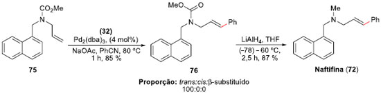 Outro trabalho envolvendo sais de arenodiazônios e acoplamentos Heck-Matsuda, agora com aminas alílicas,54 foi a síntese da Naftifina (72), um fármaco comercial com atividade anti-fúngica,55 e das Abamina (73) e Abamina SG (74), inibidores da biossíntese de ácido absícico,56 publicada em 2011 por Correia e colaboradores. A metodologia desenvolvida permitiu o acoplamento em condiçoes suaves, com excelentes régio e esterosseletividades. A síntese teve como etapa-chave a reaçao de acoplamento de Heck-Matsuda entre carbamato de metila da alil-amina 75 e o sal de benzenodiazônio 32, fornecendo o aduto de Heck 76 em 85% de rendimento com controle régio e estereoquímico do isômero E. Finalmente, a reduçao do grupo carbometóxi com LiAlH4, em 87% de rendimento, levou à síntese total da Naftifina (72), que foi obtida em apenas quatro etapas em um rendimento total de 68% (Esquema 17).