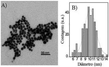 ![]() Figura 3. Micrografia obtida por MET (A) NPs de Au e (B) histograma de distribuiçao de diâmetro das NPs de Au.