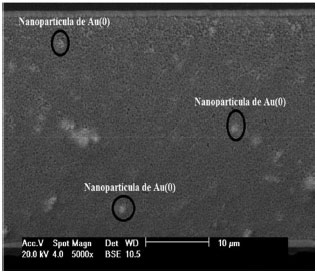 A dispersao coloidal vermelha de ouro preparada em líquido iônico BMI.PF6 foi misturada com uma soluçao de acetato de celulose (AC) dissolvida em acetona. A mistura obtida foi vertida em placa de Petri, após 5 min ocorreu à evaporaçao total do solvente e obtiveram-se os filmes biopoliméricos contendo NPs de Au suportadas, denominados AC/Au. Os filmes biopoliméricos contendo NPs de Au suportadas (AC/Au) foram analisados por microscopia eletrônica de varredura (MEV). A Figura 4 expoe a micrografia obtida por MEV. Podemos observar que o filme apresenta estrutura porosa e que pequenos aglomerados de NPs de Au estao distribuídos homogeneamente sobre todo filme biopolimérico.