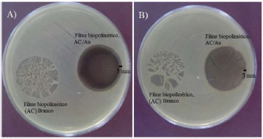 ![]() Figura 5. Atividade Antimicrobiana dos filmes biopoliméricos, AC (Branco, filme sem NPs Au) e AC/Au (filme contendo NPs de Au) frente as Bactérias: (A) E.coli e (B) S. aureus