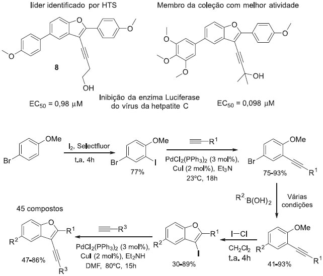As coleçoes de compostos obtidas por química combinatória, geralmente apresentam resultados promissores, quando sao planejadas tendo como base a forma do sítio ativo da enzima e ou a estrutura do ligante natural. Estas mesmas coleçoes combinatórias (ou o conjunto de coleçoes) também têm sido submetidas a HTS, com o fim de fornecer compostos líderes para o desenvolvimento de outras coleçoes direcionadas. Usando testes HTS de uma extensa coleçao de quase 340 mil compostos, He e colaboradores identificaram compostos benzofuranos como inibidores do vírus da hepatite C. A otimizaçao do núcleo benzofurânico baseada na estrutura do composto líder (8), foi conseguida através da síntese de uma coleçao de compostos focada, onde 45 compostos foram sintetizados e alguns deles foram identificados como potentes inibidores de baixa toxicidade (Esquema 1).20,21