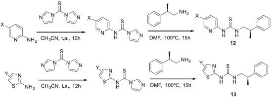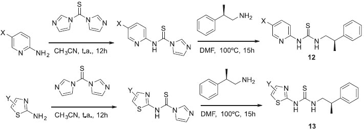 A variaçao estereoquímica também é muito utilizada na geraçao de diversidade estrutural. Embora compostos esteoisoméricos sejam constitucionalmente idênticos, existem diferenças topológicas que fazem com que estereoisômeros apresentem interaçoes diferenciadas com macromoléculas quirais e, portanto, apresentem atividades biológicas também diferenciadas. Uckun e colaboradores sintetizaram uma coleçao de halopiridil (12) e tiazoliltioureas (13) assimétricas e mostraram que os estereoisômeros com a configuraçao R possuem maior potência anti-HIV, apresentando maior inibiçao da replicaçao do vírus em células sanguíneas (Esquema 4).33