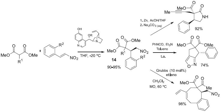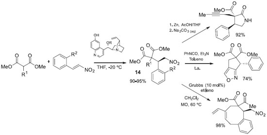 Porco e colaboradores demonstraram como múltiplos esqueletos moleculares podem ser obtidos usando estruturas densamente funcionalizadas. Utilizando a reaçao de adiçao conjugada em compostos nitro α,β-insaturados, obtiveram os composto 14, densamente funcionalizados. As funçoes dos compostos 14 foram convenientemente pareadas usando condiçoes para lactamizaçao, metátese e cicloadiçao 1,3 conforme mostrado na Esquema 6.36