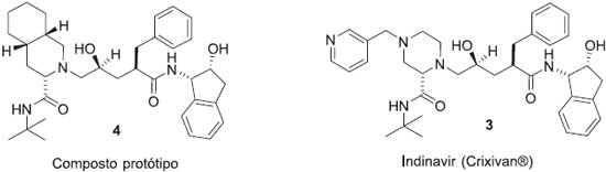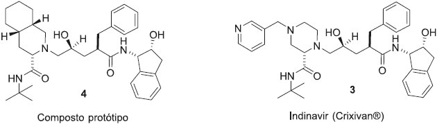 O paclitaxel (1) e a cloroquina (2) sao dois fármacos atualmente disponíveis no mercado, o primeiro é um produto natural utilizado no tratamento de diversos tipos de cânceres e que atualmente devido a alta demanda é produzido por via semissintética, e o último é um antimalárico da classe das quinolinas, à qual pertence o produto natural quinina, que foi o primeiro fármaco empregado no tratamento da malária. A Figura 1 mostra como a síntese orientada pelo alvo, utilizando a análise retrossintética foi aplicada no desenvolvimento do método para a síntese destes fármacos de origem natural.11-13 A síntese orientada pelo alvo e por consequência a análise retrossintética tem sido muito utilizada na obtençao de novos fármacos e compostos de interesse medicinal, visto que atualmente inúmeros trabalhos têm sido desenvolvidos empregando a técnica de planejamento racional. Esta técnica se baseia na identificaçao de uma proteína alvo, determinaçao estrutural da proteína e ou ligante e modelagem molecular, que fornecerá a estrutura de possíveis ligantes ativos na proteína alvo.14,15 Desta forma, a avaliaçao da capacidade de pequenas moléculas interagirem com enzimas alvo pré-selecionadas constituí parte primordial no desenvolvimento de novos fármacos. O indinavir (Crixivan, 3), fármaco atualmente usado no tratamento da AIDS, atua como inibidor da enzima Asp-protease, que é essencial no ciclo viral. A determinaçao estrutural da enzima e o conhecimento do formato e distribuiçao de carga no sítio receptor permitiu o planejamento do composto protótipo (4). Posteriormente empregando a estratégia de simplificaçao molecular o sistema cis-perisoquinolínico foi substituído por um anel piperazínico substituído, eliminando dois centros estereogênicos e dando origem ao fármaco indinavir (Figura 2).13,16