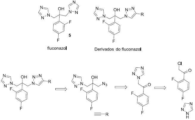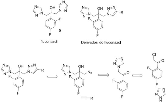 Os compostos da família dos triazóis têm sido utilizados como fármacos antifúngicos (ex: fluconazol, 5) desde os anos 1970, e o reconhecimento da atividade de inibiçao da enzima esterol 14α-desmetilase como mecanismo de açao, tem permitido o desenvolvimento de novos agentes antifúngicos desta classe.17 Aher e colaboradores mostraram como a síntese orientada pelo alvo pode ser utilizada na busca de novos derivados triazólicos antifúngicos (Figura 3).18