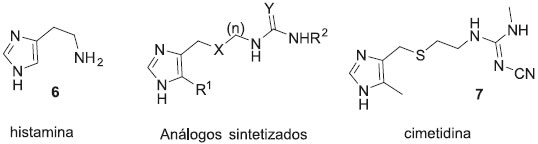 Usando a estratégia de planejamento racional de fármacos, baseado na estrutura do ligante natural, Ganellin e colaboradores sintetizaram uma série de compostos imidazólicos inspirados na estrutura da histamina (6), buscando desenvolver um antagonista para os receptores histaminérgicos do tipo H2. Variando o tamanho da cadeia lateral, metilando o anel imidazólico, e por fim modificando o grupo funcional no final da cadeia lateral obtiveram a cimetidina (7), fármaco que inaugurou a era dos blockbusters (fármacos capazes de superar a marca de 1 bilhao de dólares em vendas anuais). A cimetidina foi introduzida no mercado no ano de 1976 e revolucionou o tratamento de úlceras estomacais (Figura 4).19