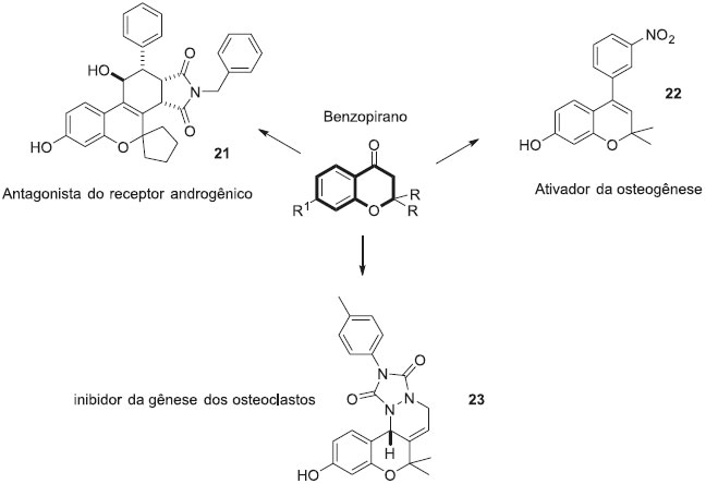 Nos últimos anos alguns trabalhos têm sido desenvolvidos combinando o conceito de síntese orientada pela diversidade estrutural com o conceito de estruturas privilegiadas. Esta estratégia se baseia no fato de que algumas classes de esqueletos moleculares (estruturas privilegiadas) sao capazes de atuar como ligantes para diversos receptores biológicos, devido às suas propriedades físico-químicas favoráveis.42,43 Alguns núcleos heterocíclicos sao conhecidos como estruturas privilegiadas, por estarem presentes em um grande número de produtos naturais bioativos. Assim, muitas coleçoes de compostos têm sido construídas usando sequencias de reaçoes químicas de forma a promover aumento da complexidade e diversificaçao estrutural em torno de esqueletos moleculares privilegiados. Park e colaboradores produziram uma coleçao de mais de 2000 compostos com esqueletos moleculares diversos, contendo o núcleo privilegiado benzopirano. A coleçao de compostos foi submetida a avaliaçoes biológicas diversas, e entre os constituintes desta coleçao foram identificados moduladores biológicos diversos, como um antagonista do receptor androgênico (21), um ativador da osteogênese (22) e um inibidor indireto da gênese dos osteoclastos (23) (Figura 8).44