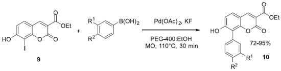 Vieira e colaboradores realizaram a diversificaçao estrutural de uma coleçao de cumarinas, empregando a variaçao de blocos sintéticos na reaçao de Suzuki, onde uma cumarina iodo substituída (9) foi submetida a reaçao com diversos ácidos fenilborônicos. As reaçoes foram realizadas em condiçoes de química verde, usando irradiaçao de micro-ondas (MO) e polietilinoglicol como solvente, e as cumarinas aril-substituídas (10) tiveram sua atividade avaliada na enzima acetilcolinesterase imobilizada, apresentando atividade inibitória (Esquema 2).29,30