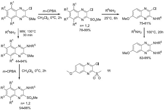Recentemente, Cogo e colaboradores sintetizaram uma coleçao de quinoxalinas empregando a variaçao de blocos sintéticos e grupos funcionais para a diversificaçao estrutural. Neste trabalho, alguns derivados quinoxalínicos contendo os grupos funcionais amino e sulfonas ou sulfóxidos, foram identificados como novos agentes promissores no tratamento da doença de chagas e leishmaniose, com destaque para o composto 11 (Esquema 3).31,32