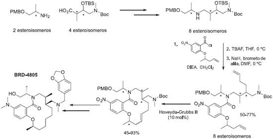 A enzima histona deacetilase (HDAC) regula uma série de processos celulares coordenando a desacetilaçao de diversas proteínas. Disfunçoes da enzima HDAC estao relacionados com uma série de doenças, como o câncer, artrite reumatóide, hipertrofia coronária e anemia. Dessa forma, inibidores de HDAC têm sido desenvolvidos para intervençao terapêutica em uma série de doenças.34 Atualmente, dois inibidores estao aprovados para uso, o ácido hidroxâmico suberoilanilida (vorinostato) e a rompidepsina (ISTODAX®), outros estao em fase clínica. A enzima HDAC possui dezoito isoformas identificadas, entretanto nenhum dos inibidores possui boa seletividade, apresentando efeitos colaterais.34 Macaurelle e colaboradores realizaram estudos da relaçao estrutura-atividade de uma coleçao de compostos na enzima histone deacetilase e observaram diferenças de atividade e seletividade de isômeros individuais, indicando a importância da estéreo-diversidade nas coleçoes de compostos. O composto BRS-4805 foi identificado como um composto líder para o desenvolvimento de novos fármacos, por apresentar seletividade muito maior que o fármaco aprovado vorinostato.34 O processo de síntese do BRS-4805 e análogos empregou como etapas chave a síntese de aminas estereoisoméricas através da formaçao de amidas e posterior reduçao, e a reaçao de metátese de fechamento de anel entre substituintes contendo ligaçoes dupla (Esquema 5).
