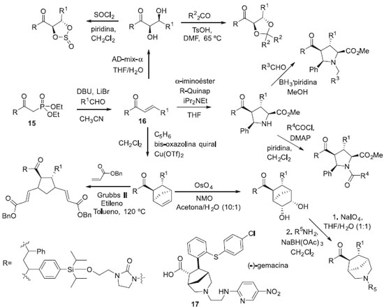 Grande diversidade de esqueletos moleculares também pode ser conseguida empregando materiais de partida sinteticamente versáteis, capazes de sofrer uma larga variedade de transformaçoes químicas envolvendo o mesmo grupo funcional. Um exemplo de DOS empregando grupo funcional de múltipla reatividade foi publicado por Thomas e colaboradores, onde um fosfonato ancorado em suporte sólido (15) foi utilizado como material de partida. O uso da ancoragem favoreceu a purificaçao dos produtos em todas as etapas de síntese.37 No trabalho desenvolvido por Thomas, inicialmente foi realizada a reaçao de Horner-Wadsworth-Emmons com diversos aldeídos (blocos sintéticos), para produzir uma série de acilimidazolinonas α,β-insaturadas (16) com configuraçao E, ancoradas em suporte sólido. Na segunda etapa, a reatividade da ligaçao dupla carbono-carbono foi explorada empregando três reaçoes catalíticas divergentes, a) dihidroxilaçao assimétrica, b) cicloadiçao (2+3) e c) cicloadiçao (4+2) para fornecer produtos com esqueletos moleculares diferentes. Os produtos obtidos na segunda etapa foram submetidos a uma série de reaçoes permitindo a diversificaçao dos esqueletos moleculares da coleçao de compostos (Esquema 7).37