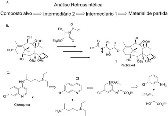 Figura 1. A. Síntese orientada pelo alvo. B. Análise retrossintética usada no planejamento de semi-síntese do paclitaxel. C. Análise retrossintética usada no planejamento de síntese da cloroquina