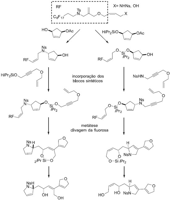 Thomas e colaboradores foram capazes de produzir uma coleçao de 242 compostos, contendo 18 esqueletos moleculares diferentes (alguns nao mostrados na figura), e empregando um número limitado de blocos sintéticos, através da síntese orientada diversidade estrutural. Esta coleçao de compostos foi submetida a avaliaçao biológica em cepas de bactérias resistentes à penicilinas e eritromicina, tais como a Staphylococcus aureus resistentes a meticilina (MRSA). Alguns compostos previniram a proliferaçao das bactérias, sendo a gemmacina (17) o mais potente dos compostos obtidos. Contrastando com os modos de geraçao de diversidade estrutural baseados em mudanças de reagentes, os processos de desdobramento sao aplicados usando substratos diferentes com características estruturais pré-determinadas de forma a poderem ser aplicados a uma determinada condiçao reacional produzindo diferentes esqueletos moleculares. Morton e colaboradores desenvolveram um método onde pares de blocos sintéticos insaturados foram ligados a uma fase fluorosa, gerando uma grande variedade de substratos, onde cada um destes substratos continha ligaçoes duplas. Os compostos foram submetidos a reaçoes de metátese, para a ciclizaçao intramolecular gerando uma coleçao de compostos com esqueletos moleculares diferentes. Interessantemente, a fase fluorosa foi projetada de forma a liberar em soluçao os produtos ciclizados, facilitando o processo de purificaçao (Figura 6).38