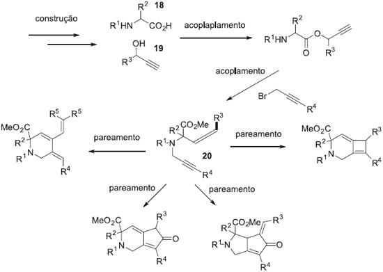 A estratégia de construir/acoplar/parear foi aplicada pelo grupo de Brummond para explorar a habilidade de alguns catalisadores metálicos na síntese de diversos esqueletos moleculares. Uma série de blocos sintéticos α-aminoácidos (18) e alcoóis propargílicos (19) foram acoplados e posteriormente transformados em alquinil alenos (20) que puderam ser pareados em reaçoes intramoleculares do tipo Alder-Ene, Pauson-Khand e cicloadiçao (2+2) (Figura 7).40,41