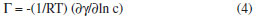 PARTE EXPERIMENTAL Materiais Metanol (Synth); Acido clorídrico (Merck); Peneira molecular 4A (Merck) n-Butanol (Synth); Nitrogênio (White Martins); Diclorometano (Synth); Hidróxido de sódio (Merck); Hexano (Synth); Acetato de etila (Synth); Trifluoreto de boro dietil-eterato (Merck); Cloreto de Sódio (Merck); Hidróxido de Cálcio (Merck), Hidróxido de amônio (Synth); 4-metil-2,6-di-terc-butilfenol (Merck); Sulfato de sódio anidro (Merck); Acido acético glacial (Synth); Acido sulfúrico (Synth); Anidrido acético (Synth); Etanol (Synth); Hidróxido de potássio (Merck); Fenolftaleína (Merck); Bicarbonato de sódio (Merck); Trimetilamina (Synth); Acetonitrila (Synth). Todos os solventes foram utilizados como recebidos, sem purificaçao prévia. O LCC técnico foi proveniente da fábrica de castanha CIONE (Fortaleza-Ce) e o LCC natural foi obtido a partir das cascas de castanhas provenientes da EMBRAPA (Fortaleza-Ce), clones CCP09. O LCC21,22 e seus constituintes23,24 foram extraídos segundo metodologia pré-estabelecida. A amilose foi isolada a partir do amido extraído da batata inglesa (Solanum tuberosum L.) segundo Whistler,25 pré-tratada, acetilada e hidrolisada segundo metodologia estabelecida.26-29 Os alquilfenil glicosídeos foram sintetizados pelo método de George John e colaboradores sem nenhuma modificaçao.30 Detalhes da síntese dos alquilfenil glicosídeos podem ser encontrados no material suplementar. Determinaçao do grau de substituiçao (GS) e percentagem de acetilaçao (PA) O grau de substituiçao (GS)31 e a percentagem de acetilaçao (PA)32 foram calculados a partir das seguintes expressoes: ![]() ![]() em que: mL branco é o volume gasto na titulaçao da amilose após tratamento com KOH 1 mol L-1; mL amostra é o volume gasto na titulaçao dos triacetatos após tratamento com KOH 1 mol L-1; Molaridade do HCl = 0,501; mamostra é a massa da amostra. Os valores 162 e 43 sao relativos ao peso molecular do anidro D-glicose e ao peso molecular do grupo acetil, respectivamente. O valor 42 refere-se ao peso molecular do grupo acetil após a saída de um hidrogênio, ao se ligar a anidroglicose. O grau de substituiçao também foi determinado por RMN 1H pela seguinte expressao:33 ![]() Espectroscopia de absorçao na regiao do infravermelho (FTIR) Os espectros FTIR dos surfactantes foram obtidos em pastilha de KBr em um espectrômetro SHIMADZU FTIR 8300 com varredura de 400 a 4000 cm-1. Ressonância magnética nuclear de 1H e 13C (RMN 1H e RMN 13C) Os alquilfenil oligoglicosídeos foram caracterizados por espectroscopia, RMN 1H e RMN 13C. As atribuiçoes dos sinais de absorçao de RMN 1H e RMN 13C foram realizadas pelas técnicas HMQC e COSY, e a conformaçao das unidades glicosídicas dos grupos cabeça hidrofílicos confirmadas pela técnica NOESY. Os espectros de RMN 1H e RMN 13C em soluçao (clorofórmio deuterado para materiais acetilados, LCC e seus componentes, água deuterada para os surfactantes e DSS como padrao interno) foram obtidos em um equipamento Brucker Avance 300, com transformada de Fourier, funcionando a 300 MHz na frequência do hidrogênio, e a 75 MHz para RMN 13C. Tensao superficial Para as medidas da tensao superficial (γ) foi utilizada uma balança de torçao da White Elec. Inst. Co. LTD. Todas as medidas foram feitas a 30 ± 0,1 ºC. Parâmetros termodinâmicos foram calculados a partir das isotermas de tensao superficial de equilíbrio versus logaritmo natural da concentraçao (Eqs 4-10).34-38 A partir das isotermas de γ versus ln c (g dm-3) foi determinado o excesso interfacial, ![]() em que: (∂γ/∂ln c) é obtido a partir das inclinaçoes das curvas; R é a constante universal dos gases (8,314 J.K-1mol-1); T é a temperatura em Kelvin. E a área por molécula (A) é calculada por: ![]() em que: NA é o número de Avogadro. π é a pressao interfacial, a qual é calculada por: ![]() em que: γ é a tensao superficial da água pura; gcmc é o valor da tensao superficial das soluçoes dos surfactantes (Figura 12S e Tabela 3).