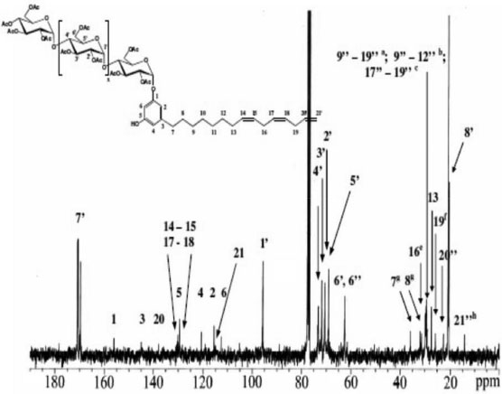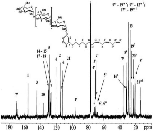 ![]() Figura 3. Espectro RMN 13C do Cardanil oligoglicosídeo em clorofórmio deuterado