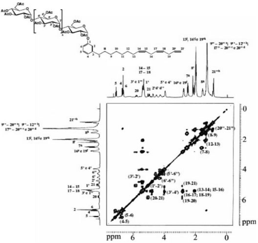 Os espectros de correlaçao, COSY (Figuras 5) e HMQC (Figuras 6), foram poderosas ferramentas na elucidaçao das estruturas dos surfactantes sintetizados. As principais correlaçoes 2D estao na Tabela 2.