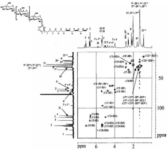 ![]() Figura 6. Espectro HMQC do Cardanil oligoglicosídeo em clorofórmio deuterado
