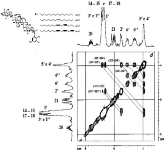 Os picos cruzados do espectro NOESY mostraram que a conformaçao preferida das unidades glicosídicas nos grupos cabeça sao do tipo 4C1 com uma configuraçao anomérica α. No espectro NOESY (Figura 7) foram observadas as seguintes relaçoes espaciais (valores em ppm): unidades glicosídicas: (5,32 - 4,74; H1' - H2'); (5,44 - 4,11; H3' - H5'); (5,32 - 3,98; H1' - H4'); (4,54 - 4,31; H6' - H6''); (4,74 - 3,98; H2'- H4').