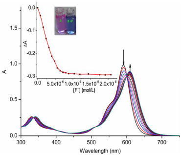 ![]() Figure 1. UV-Vis spectra of 3 (1.1 x 10−5 mol L−1) in CH3CN upon the addition of TBA-F from 0 to 2.1 x 10−5 mol L−1. Inset: nonlinear curve fitting as a function of [F-] monitored at 591 nm