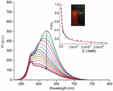 ![]() Figure 2. Fluorescence spectra of 3 (1.1 x 10−6 mol L−1) in CH3CN upon addition of TBA-F at concentrations from 0 to 3.6 x 10−6 mol L−1. Inset: nonlinear curve fitting as a function of [F−] monitored at 623 nm. Excitation was at 580 nm