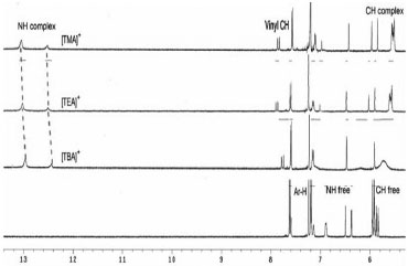 ![]() Figure 3. Partial 1H NMR spectra of 3 (1.1 x 10−2 mol L−1) in CDCl3 and in the presence of 2.0 equivalents of F− as TBA+, TEA+, and TMA+ salts