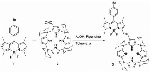 EXPERIMENTAL Materials and methods All reagents were commercially obtained and used without further purification. In titration experiments, F- was added in the form of TBA+, TEA+, and TMA+ salts. The fluoride salts were purchased from Alfa Aesar and were stored in a desiccator under vacuum. Chromatography-grade CH3CN was used. 1H NMR and 13C NMR spectra were obtained using a Varian 400 MHz INOVA spectrometer with the samples dissolved in CDCl3. ESI-MS spectra were obtained using a Waters Micromass ZQ-4000 mass spectrometer. C, H, N elemental analyses were performed using Vario-EL. UV-Vis spectra were obtained using a PerkinElmer Lambda 35 spectrometer. Fluorescence spectra were obtained using a PerkinElmer LS55 spectrometer. All experiments were conducted at room temperature (25 °C). A solution of BODIPY dye 3 (1.1 x 10−3 mol L−1) in CH3CN was prepared and diluted to a concentration appropriate for UV-Vis and fluorescence spectroscopies; the appropriate F− salt (TBA-F, TEA-F, or TMA-F) dissolved in CH3CN was added to attain the F− concentration of 1.1 x 10−2 mol L−1, and the absorption/emission spectra of the resulting solution were immediately obtained. Nonlinear curves were fit to the absorption and fluorescence data and were expressed as equations (1) and (2), respectively.18 ![]() ![]() where A and A0 are the absorbance of dye 3 in the presence and absence of F-, respectively, FI and FI0 are their corresponding fluorescence intensities, CF and CD are the concentrations of F- and dye 3, respectively, and K is the association constant. Synthesis of 3-[2-(β-tetracyclohexylcalix[4]pyrrolyl)ethenyl]-4,4-difluoro-8-(4-bromo)phenyl-1,5,7-trimethyl-3a,4a-diaza-4-bora-s-indacene (3) Targeted dye 3 was prepared as shown in Scheme 1. Compound 119 (0.91 g, 2.00 mmol) and formylcalix[4]pyrrole 2 (1.23 g, 2 mmol) were refluxed in a mixture of dry toluene (50 mL), piperidine (0.5 mL), and AcOH (0.5 mL). The mixture was heated for 10 h in a Dean-Stark apparatus to azeotropically remove any water formed. The solvents were removed under reduced pressure, and the product was purified by column chromatography (CH2Cl2/hexane, 1:1) to obtain 3 as a purple solid (0.70 g). Yield: 35%. M.p. > 300 °C. ESI-MS: m/z = 1001.3 (M + H+). 1H NMR (400 MHz, CDCl3) δ: 1.42 (s, 6H, CH3), 1.49 (m, 30H, CH2), 2.00 (m, 10H, CH2), 2.60 (s, 3H, CH3), 5.88-6.00 (m, 7H, pyrrolic CH), 5.91-5.94 (m, 2H, pyrrolic CH), 5.96 (d, 3.2 Hz, 2H, pyrrolic CH), 6.40 (d, J = 2.4 Hz, 1H, NH), 6.49 (s, 1H, NH), 7.16 (s, 2H, 2NH), 7.18-7.24 (m, 2H, 1H for vinylic, 1H, CH), 7.63-7.67 (m, 3H, 2H for ArH, 1H for vinylic). 13C NMR (100 MHz, CDCl3) δ: 14.7, 14.7, 15.0, 115.8, 116.9, 117.8, 121,4, 123.3, 129.3, 129.4, 130.1, 132.4, 134.1, 136.5, 138.3, 142.1, 142.4, 142.5, 153.8, 153.8, 155.1, 156.7. Anal. calcd. for 3 (C60H68BBrF2N6): C, 71.93; H, 6.84; N, 8.39. Found: C, 71.96; H, 6.90; N, 8.34.