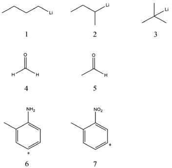 ![]() Figura 1. Estructuras de los derivados órgano-litio de la serie 1 (1, 2 y 3), derivados carbonilo de la serie 2 (4, y 5), y derivados aromáticos de la serie 3 (6 y 7). Con asterisco con los átomos de carbono más reactivos de los compuestos 6 y 7
