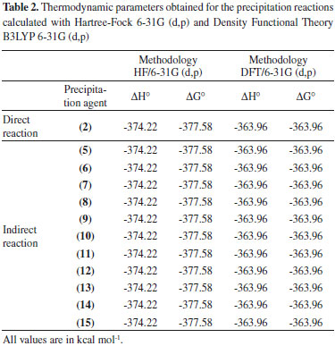 CONCLUSIONS Finally, it is possible to say that the quantum reactive indexes show direct correlation with the higher spontaneity of the indirect reaction for HF and DFT methods. From the quantum reactive indexes values (χ, η, ω, εHOMO and µ), it is possible to say that one characteristic is necessary to have a higher percentage yield: more acid character of the compounds formed by CA and the precipitation agents (when compared to CA). As very consistent results have been obtained in this work for the main and also for other precipitation agents, in the future these theoretical properties could be useful to evaluate new precipitation agents. This would economize time and, most important, reagents and equipment, improving the industrial process.