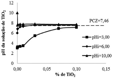 ![]() Figura 2. Determinaçao gráfica do ponto de carga zero (PCZ) do TiO2