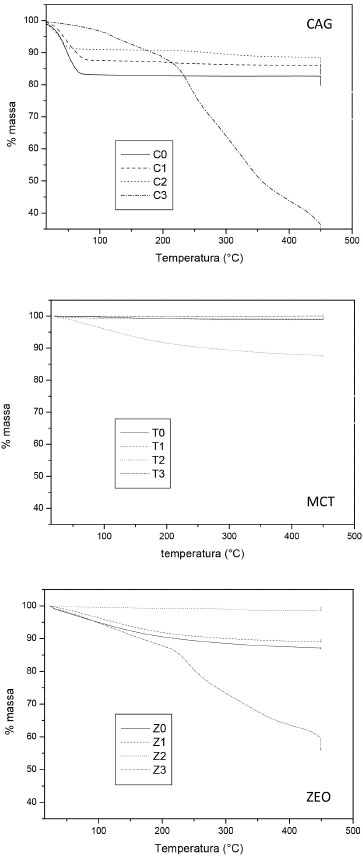 ![]() Figura 3. Análise térmica (7 ºC min-1 em O2) dos meios suportes ZEO, CAG e MCT contendo TiO2 imobilizado conforme os diferentes métodos (1, 2 e 3), e meio suporte in natura (0)