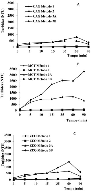 ![]() Figura 5. Turbidez gerada em meio aquoso pelo emprego dos materiais recobertos com TiO2 pelos diferentes métodos nos meios suportes: A) CAG, B) MCT e C) ZEO